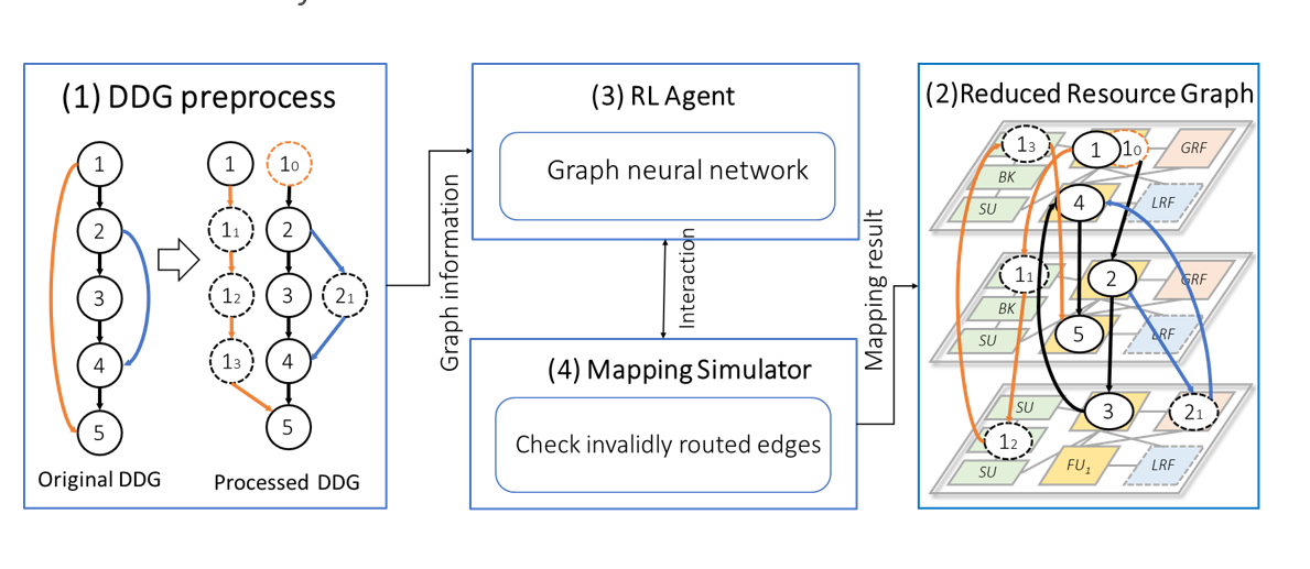 GNN + RL maps loop DDGs onto CGRAs (min II, legal routes). ICCAD 2022.